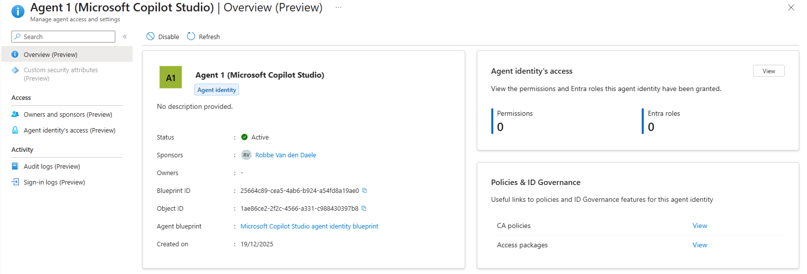 The benefit of this is as you can see in the documentation on how Agent Identities can be created, that Agent Identities always need to have a sponsor set. In the background, Copilot Studio will assign the user initiating the Agent Identity creation process as sponsor to the identity:
