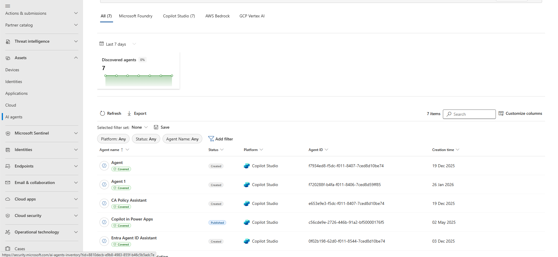 But wait, in this Defender XDR view in my test environment, I find 7 agents created in Copilot Studio but only 5 Copilot Studio agents in Entra ID? And additionally, I have an Agent in Defender XDR called ‘CA Policy Assistant’ for which I do not find a related Agent Identity in Entra ID: