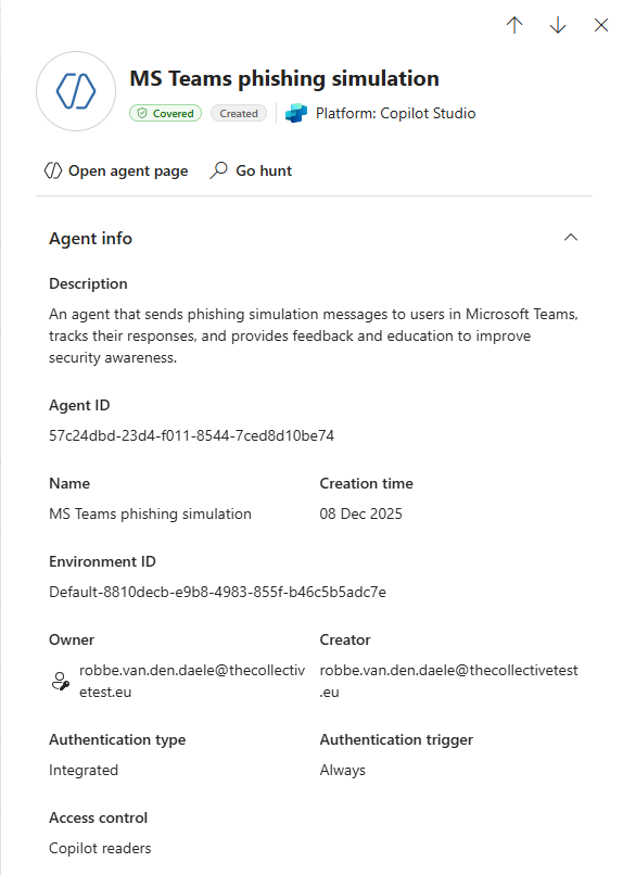 Do you remember the first challenge we discussed where we could not find the creator of a ’legacy’ agent application service principal using Entra ID? In the Defender XDR AI agents asset inventory you can see who created the agent in Copilot Studio!