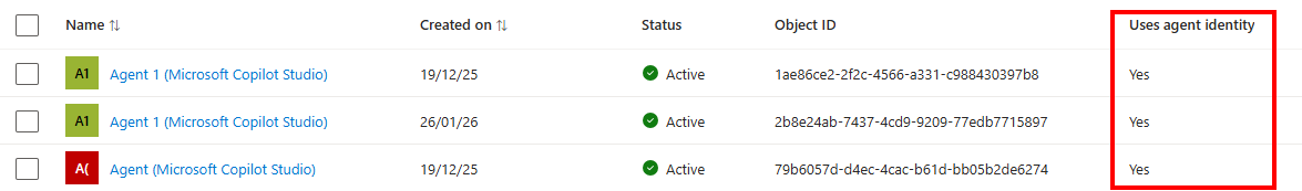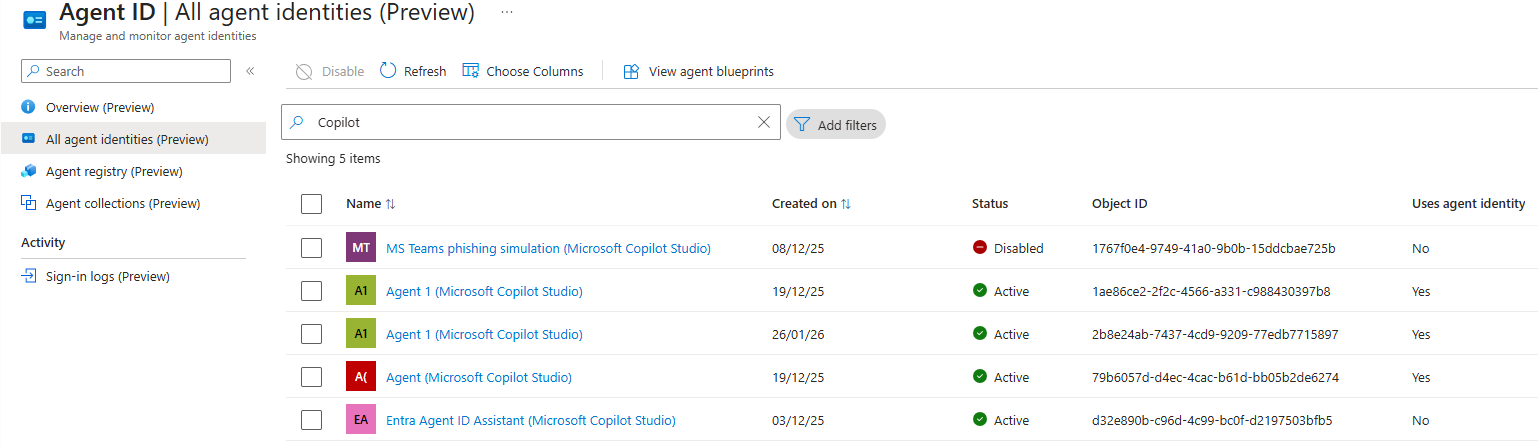 Once enabled, you will see that new Copilot Studio created identities will have an agent identity: