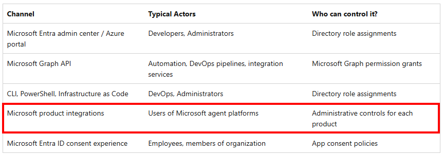 In the Microsoft learn page we can find how Agent Identities can be created. Here we can see that most of the channels are mostly related to admins, but also that there is one channel called ‘Microsoft product integrations’: