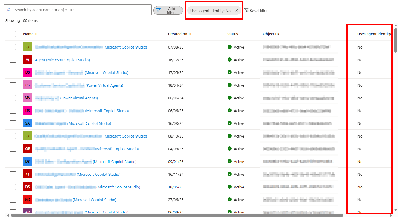 Looking at the agent identity list in Agent ID, you will probably see already a lot of agents created in your organization. As mentioned earlier, the biggest part will probably come from Copilot Studio because end-users received access to this application. The challenge with Copilot Studio is that by default, the agent identities it creates still uses ’legacy’ application service principals (just like the service principals we use for other non-ai applications). You can see this in the UI by adding the ‘Uses agent identity’ column and filter on ‘No’: