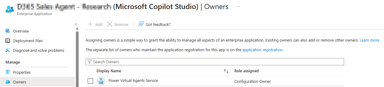 With these applications service principals, the user that created the agent is not added by default as a sponsor or owner of the Agent Identity, which makes it hard for an administrator to see the user who created the identity via the Agent ID blade in the Entra Admin portal. For Copilot Studio specifically, you will see that the Owner will always be ‘Power Virtual Agents Service’: