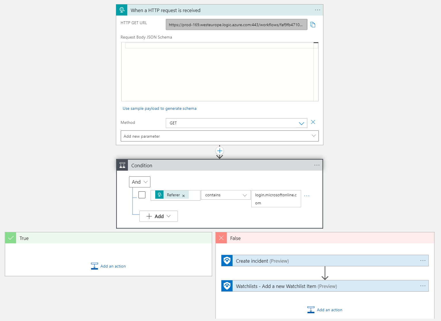 Since this is an awesome way to detect connections to AitM sites without having to rely on Microsoft detection logic or Threat Intelligence sources, I wanted to create a simple Logic App that creates an incident in Microsoft Sentinel when this occurs. After all, the only thing we need is the custom CSS and a GET REST API endpoint to build this detection. For me, the logic solution to build this was an Azure Logic App.