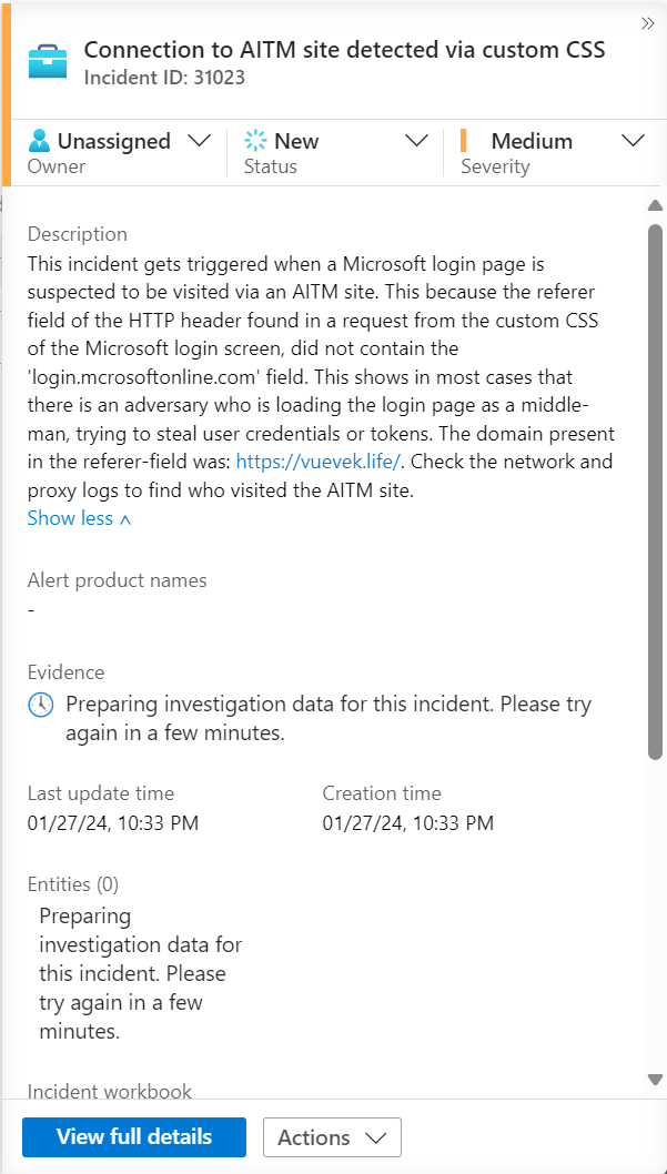 The Logic App creates a Sentinel incident, and adds the phishing domain that was detected in the HTTP header to the description of the incident: