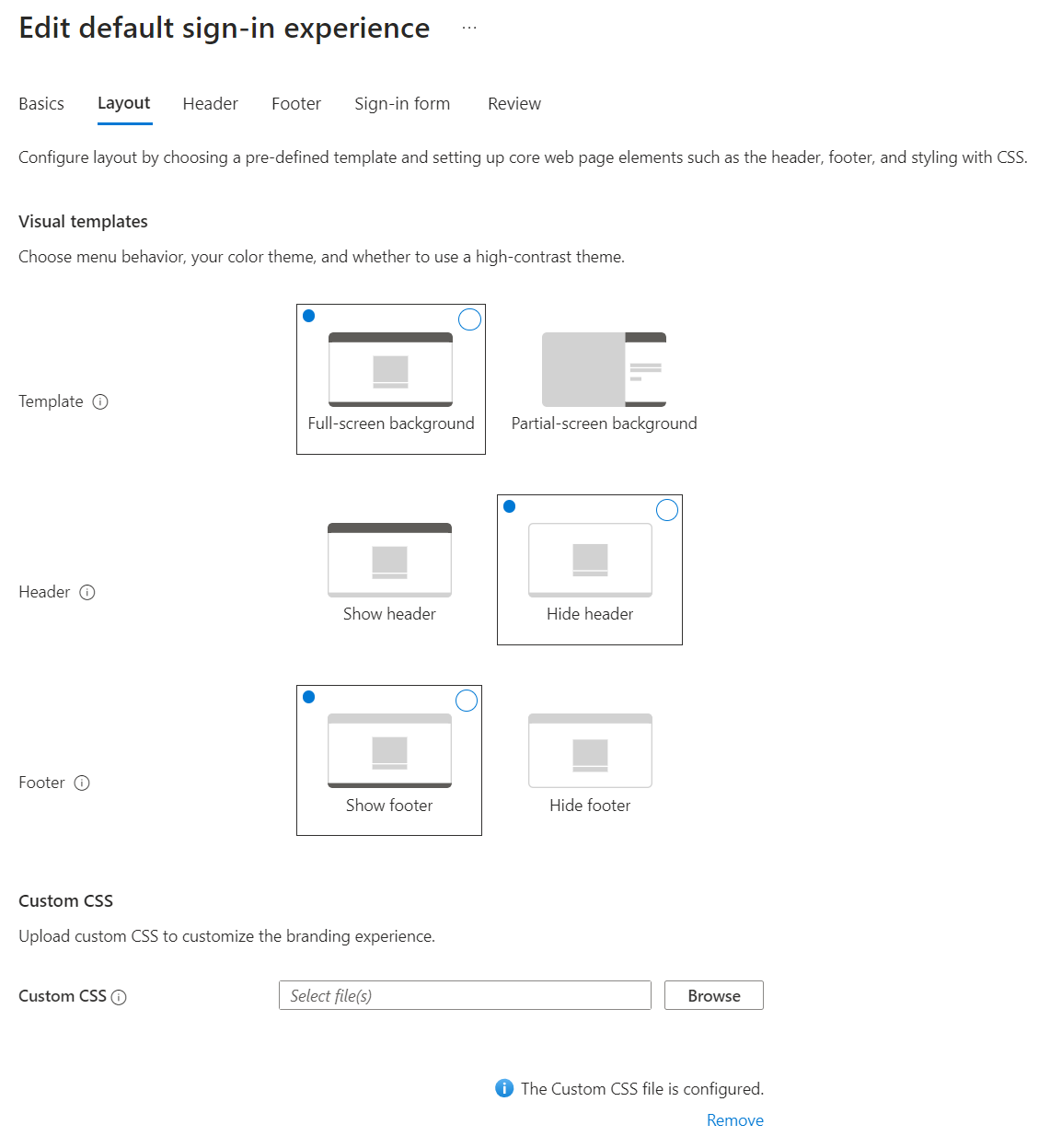 Once you have this CSS file, you need to upload the file in the portal by going to Company branding > Default sign-in > Edit > Layout > Custom CSS.