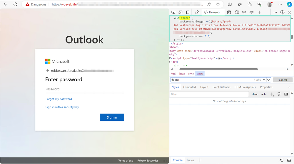 selector we can add an invisible background image to the footer of the login page, and use the url() parameter in CSS to try and trigger the Logic App we just created. Below you find the CSS file I used to trigger the Logic App.