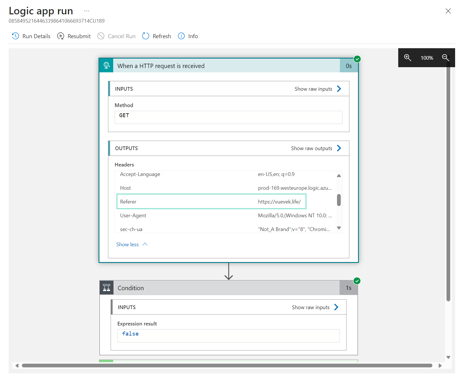 If everything works fine, the Logic App should have triggered and logged the ‘referer’ field in the HTTP header: