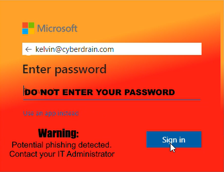 class in the custom CSS. By doing this, the login page changes for the end user when they connect via an AitM site, letting them know not to enter their password. Since we already created a Sentinel incident giving us the possibility to force automatic password resets, I did not build this feature in the Logic App. Although, it might be a fun thing to do, extending the project further.