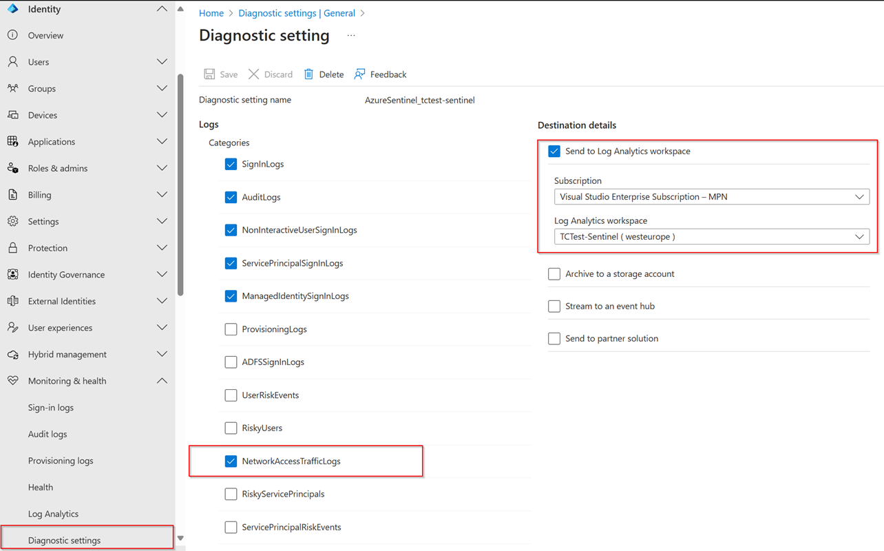 Before we can correlate the logs between MDE and GSA, we need to have the logs somewhere stored. For this we can choose if we want to do the correlation in Microsoft Sentinel or in Defender XDR. Even if you want to do the correlation in Defender XDR, we have to ingest the GSA NetworkAccessTraffic logs into Microsoft Sentinel first. To do this, navigate to entra.microsoft.com and go to Identity > Monitoring & Health > Diagnostic Settings. Here you can choose to send the logs to your Microsoft Sentinel Log Analytics workspace.