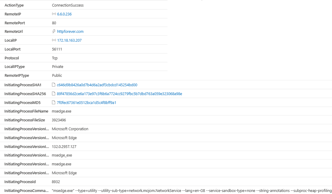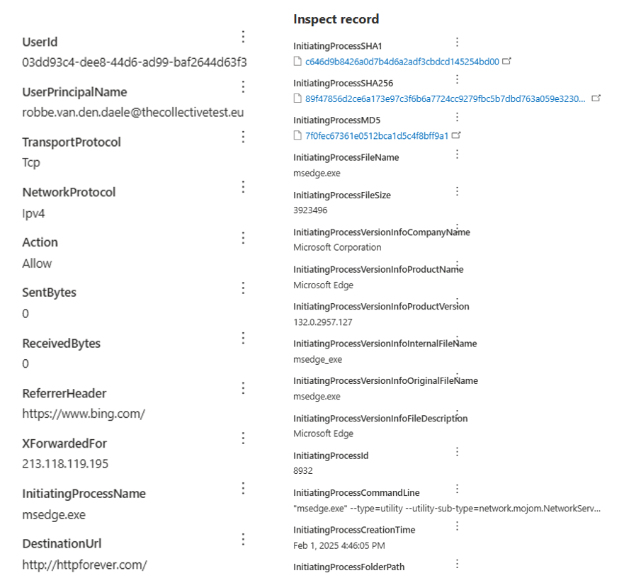If you do detection engineering, you know that the more information is available the better. With MDE, we have detailed information on the process that generated specific network events, while we have more detailed information on HTTP Headers in GSA logs. When combining this together we can: