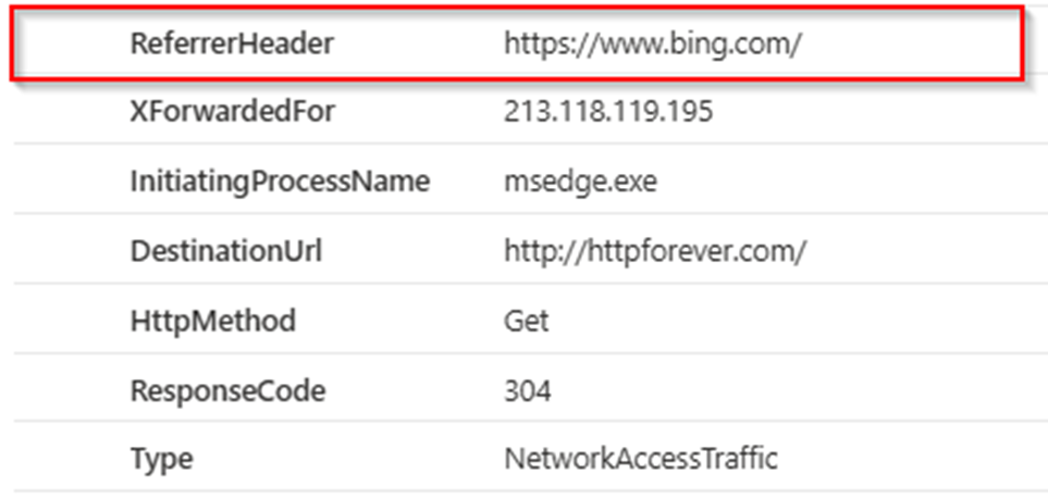 But when combining the GSA logs with MDE, we can now see the source website via the HTTP ReferrerHeader field:
