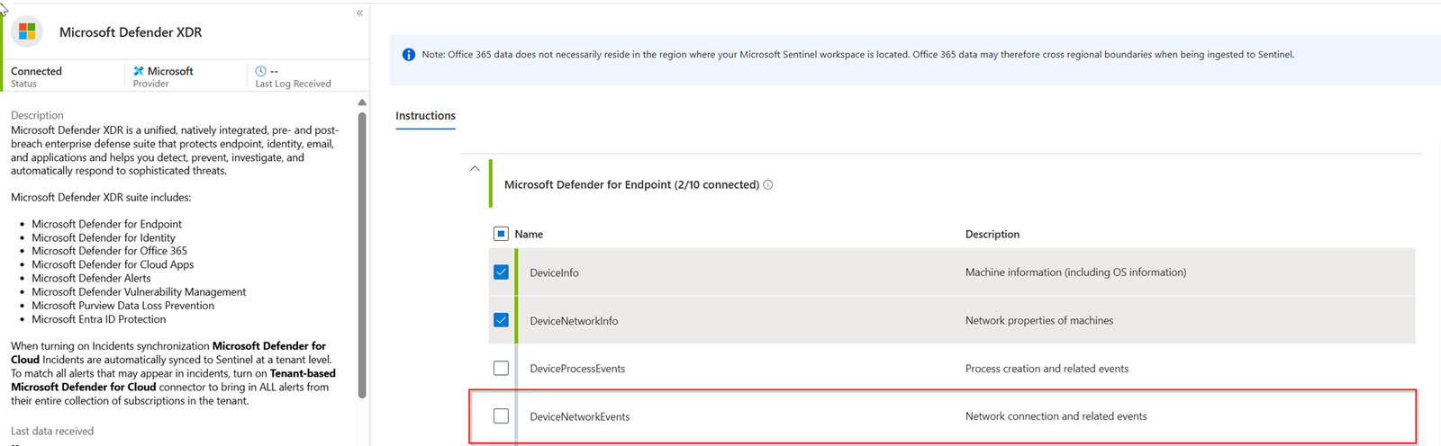 If you want to do the correlation in Microsoft Sentinel, the second step is to ingest the DeviceNetworkEvents table into Sentinel. Be aware that this can become very costly, since this is a lot of data that will be stored! Go to the Microsoft Defender XDR data connector and enable the DeviceNetworkEvents table:
