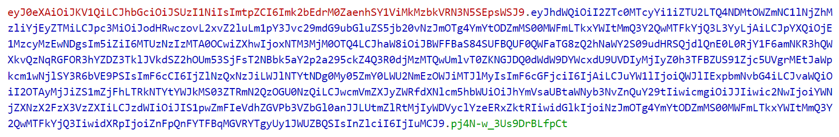 ) and Base 64 encoded. An example of an access token can be found below, where the red part is the header, the blue part is the payload, and the green part is the signature: