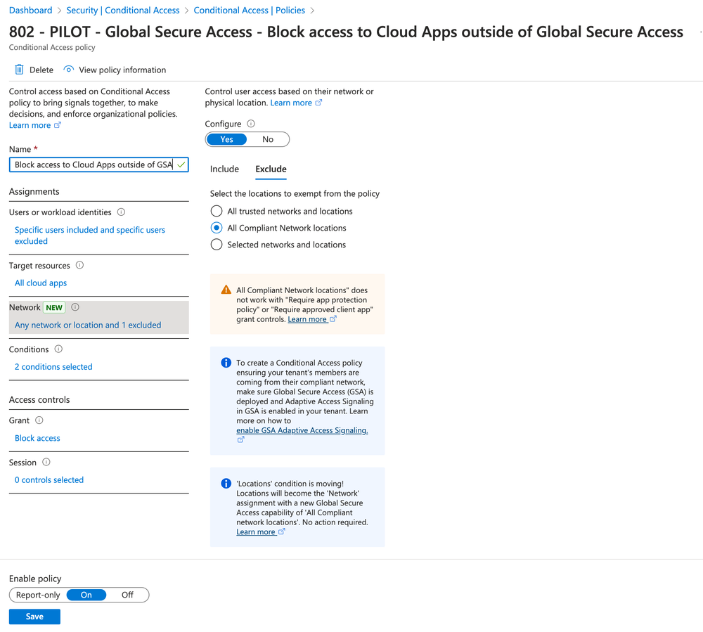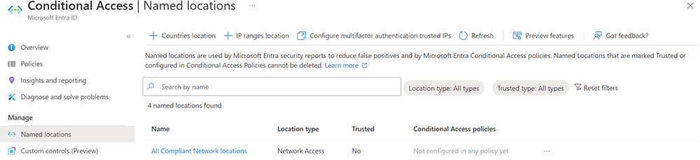 With the Microsoft profile in Global Secure Access, you can protect your users by requiring a ‘compliant network location’ in conditional access. What this will do in the background is add the Microsoft SSE POCs as trusted named locations, which can then be used in your conditional access policies.