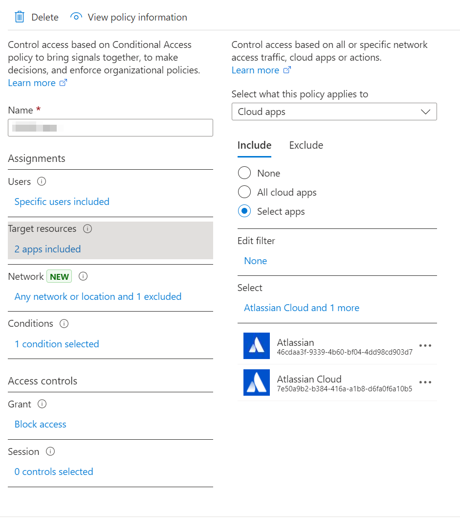 In the example below I created a conditional access policy to block access to a third-party application Atlassian, except when the connection comes from a compliant network: