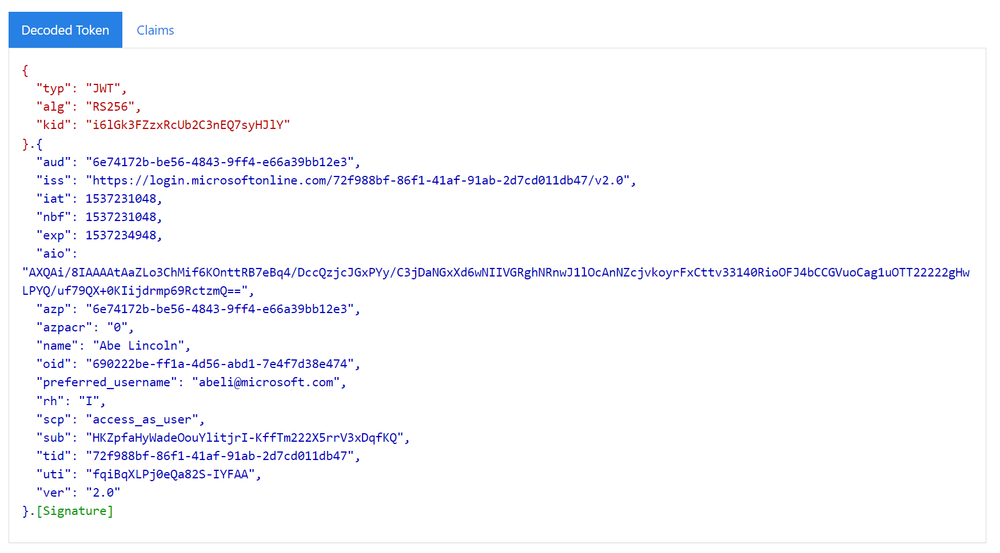 - Payload - Contains the token claims about the user and application that is attempting to call a service.