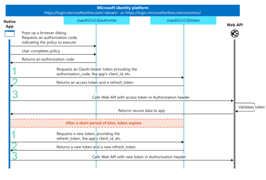 In below figure you can find an example of the Entra ID OAuth 2.0 auto code grant flow, including the following steps: