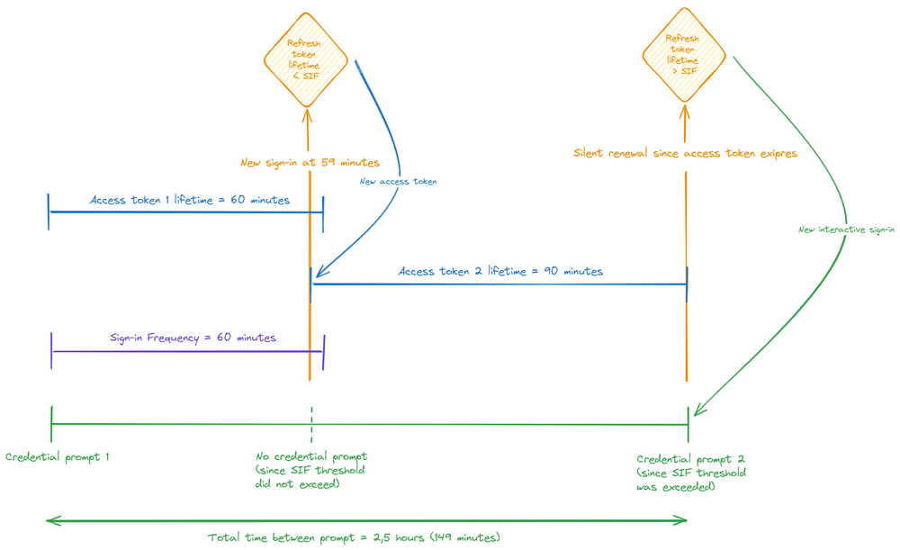 max access token lifetime + SIF = max. time between authentication prompts (90 min + 60 min = 150 min)