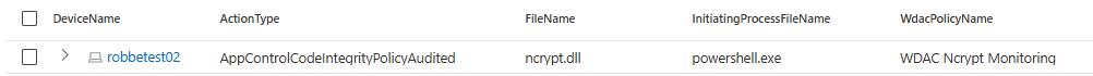 12| where ActionType startswith "AppControl" and FileName =~ "ncrypt.dll"