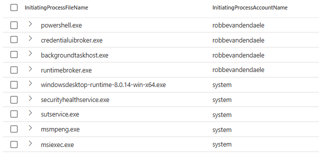 3| distinct InitiatingProcessFileName, InitiatingProcessAccountName