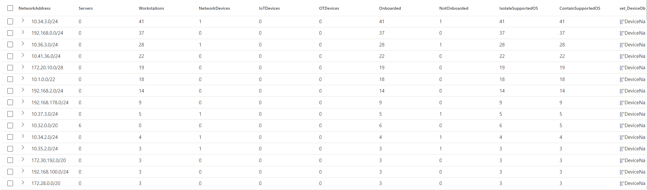 36 | summarize make_set(DeviceObj) by NetworkAddress;