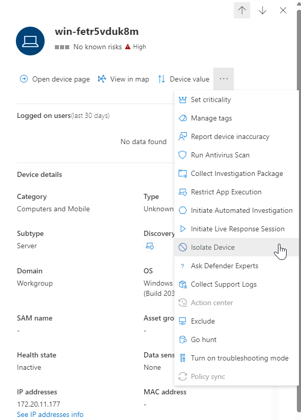 In a later blog post, I will explain how we can integrate third-party networking solution for your isolation and containment scenario’s with Microsoft Sentinel.