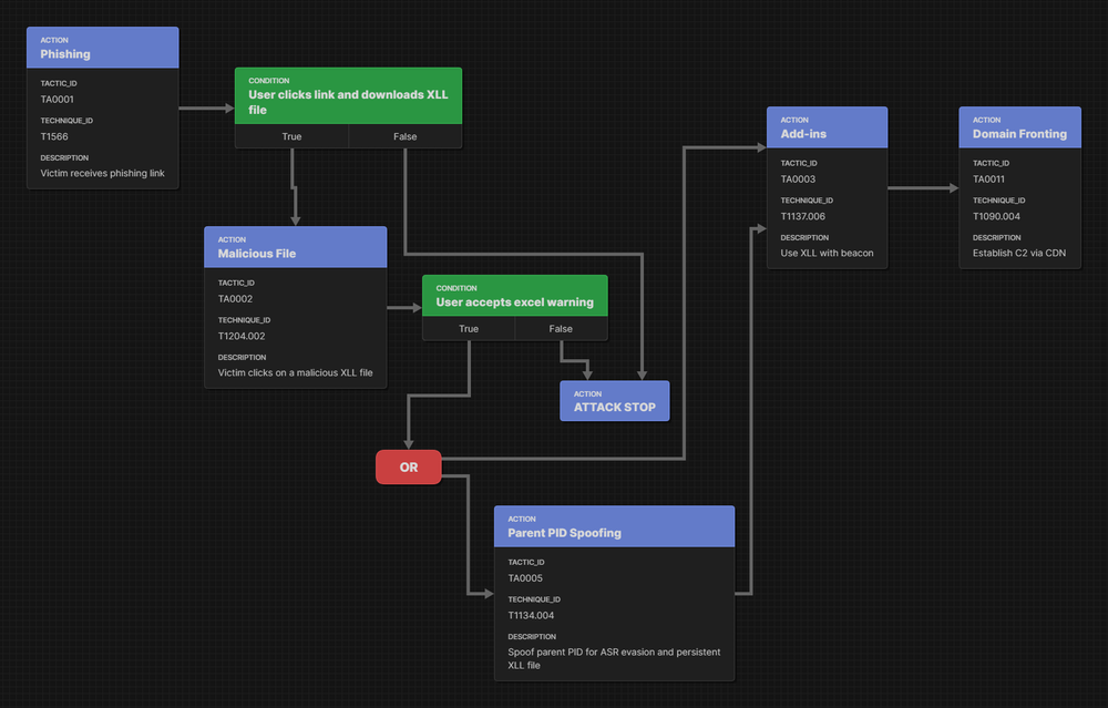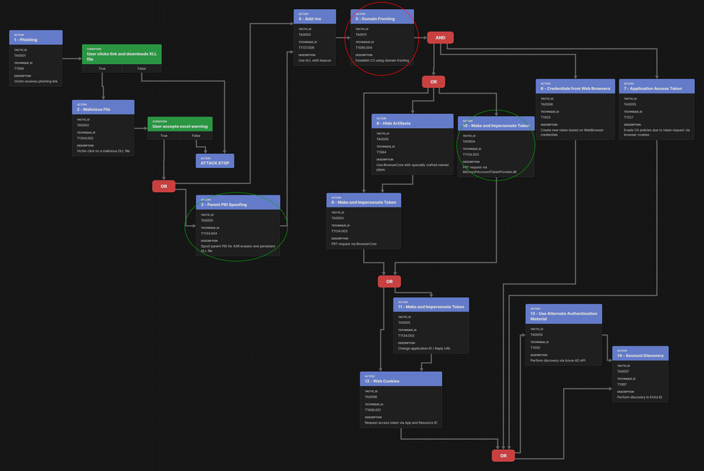 I wanted to quickly show the detection confidence I think there is when you use MDE with the custom detection rules. For this, I first created an Attack Frow for the complete scenario:
