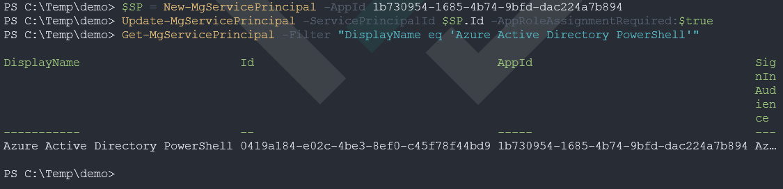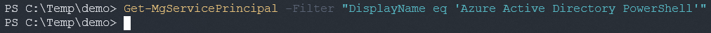The above command will create the service principle and set the assignment required property to True. If we try to get the service principle for Azure AD PowerShell afterward, you can see that the service principle now exists.