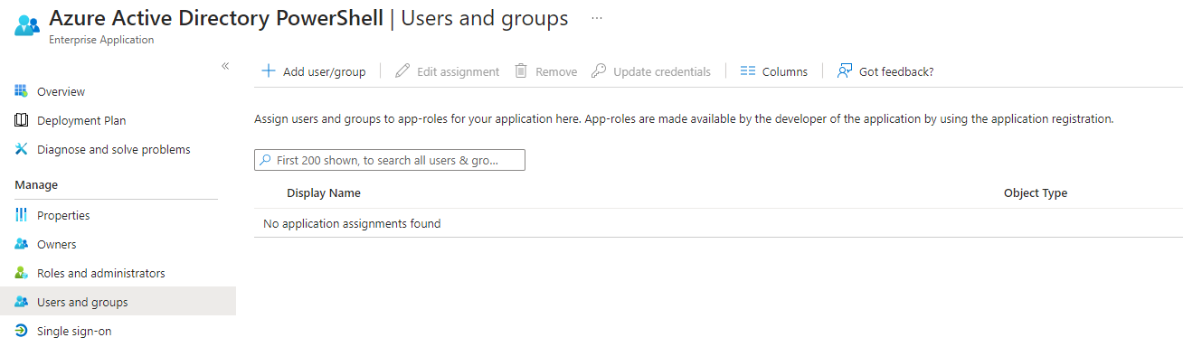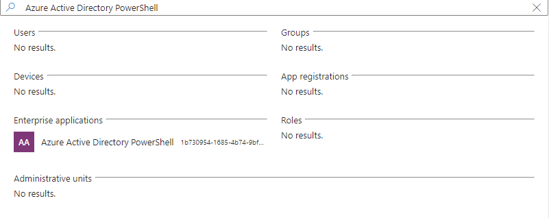 The first way we can protect the Azure AD PowerShell application is by forcing an assignment requirement for the application. But here comes the tricky part. By default, the Azure Active Directory PowerShell application is not surfaced in the Entra ID portal: