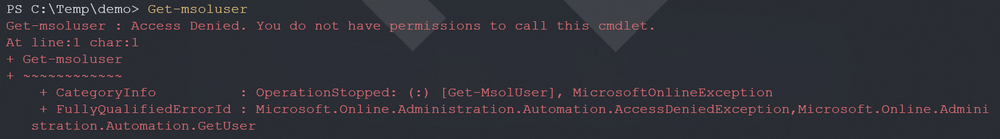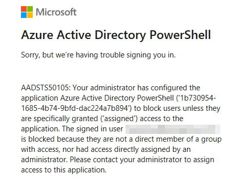 If a user now tries to connect to Azure AD PowerShell without being assigned to the application, they will get an error message: