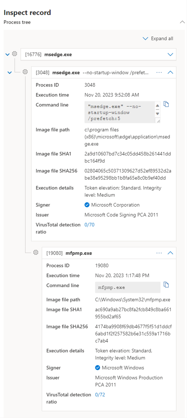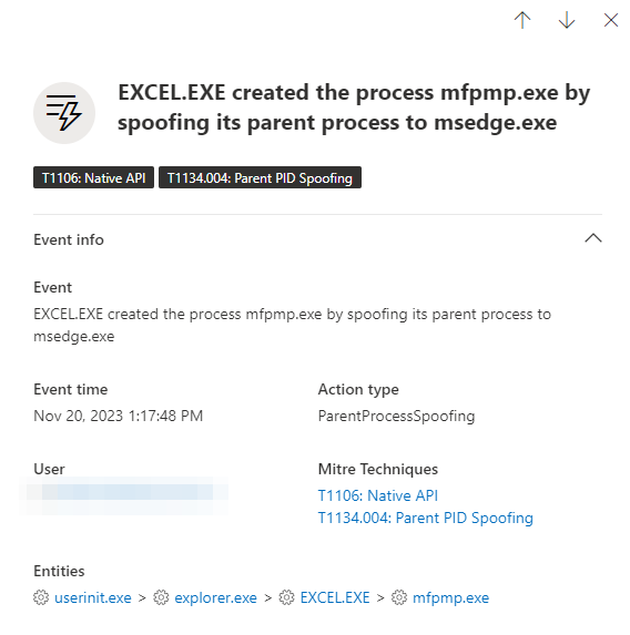Even though these ASR rules work great in most of the cases, attackers are still able to bypass some of the rules (aka perform defense evasion). One of the techniques they can use for this is “T1134.004: Parent PID Spoofing” where they perform actions from Office Applications by spoofing the parent process ID that performs the action. A procedure I encountered is where the attackers created a new process (in this case mfpmp.exe) from excel.exe by spoofing the parent process to msedge.exe.