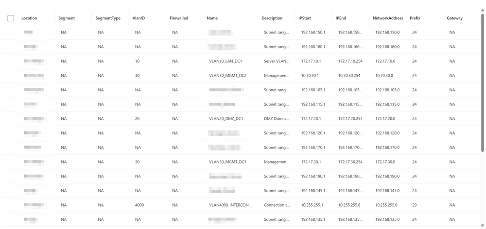 1Location;Segment;SegmentType;VlanID;Firewalled;Name;Description;IPStart;IPEnd;NetworkAddress;Prefix;Gateway