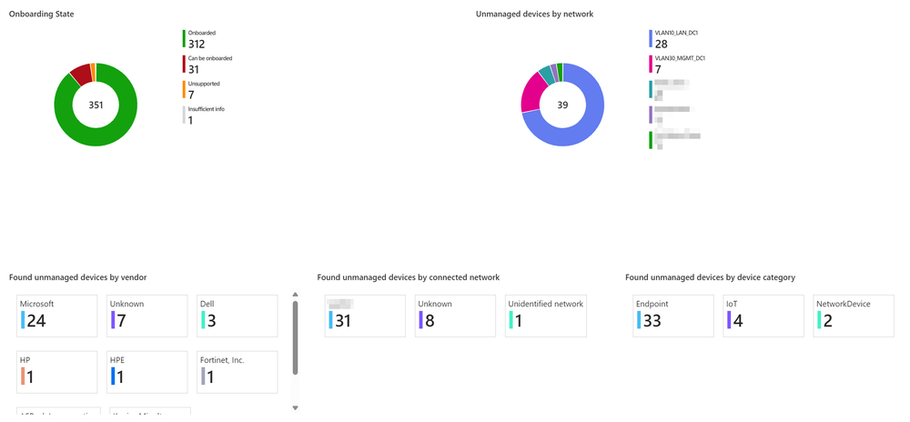 - At the bottom, you see the unmanaged devices counted by vendor, connected network, and device category. This can help in understanding what kind of devices these unmanaged devices are.