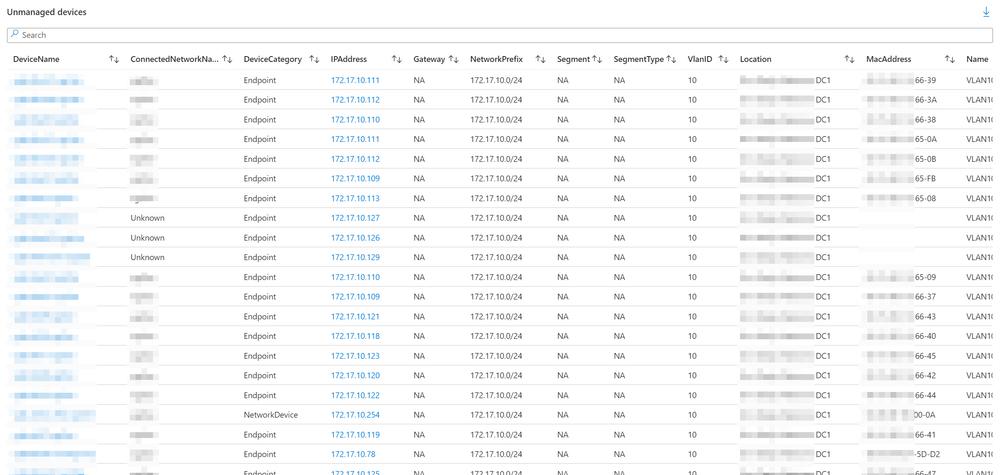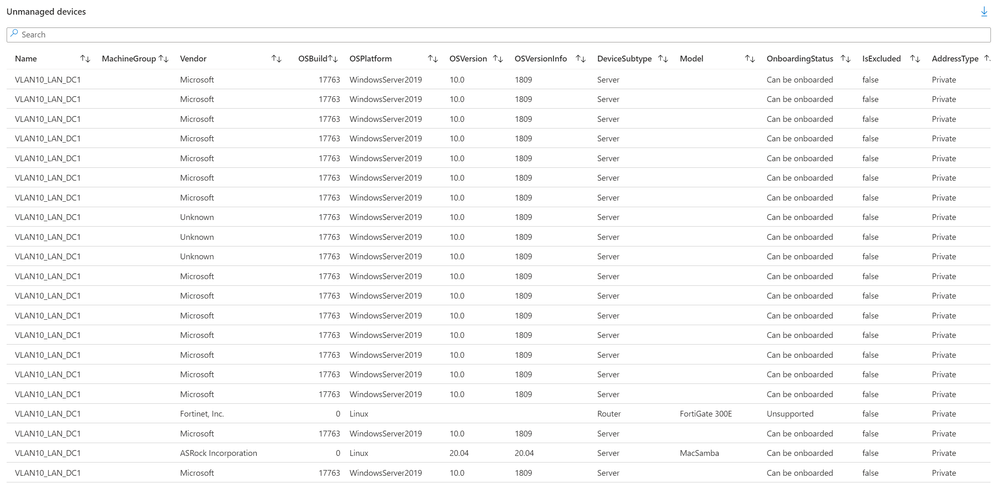 In the above screenshot, you can see the overview graphs I added to the workbook. The goals of these is to give you a better idea of the onboarding state of your environment, but also to give an idea where the unmanaged devices live and what kind of devices these are.