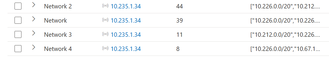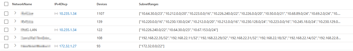 24| summarize Devices = count(), SubnetRanges = make_set(SubnetRange) by NetworkName, IPv4Dhcp