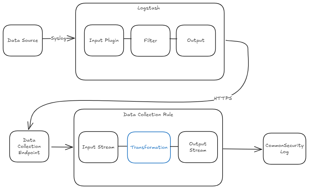 When using Logstash, you have the power to normalize and filter your data in the Logstash filter plugins. This is very powerful with a lot of flexibility, but is a bit less maintainable in my opinion. When you have multiple customers like I do with normalization logic existing in Logstash, you will need to change the Logstash configuration files on all the Logstash instances when a change in the normalization logic needs to happen. Exactly because of this reason, I like to do the normalization in the transformation logic of a Data Collection Rule in Azure.