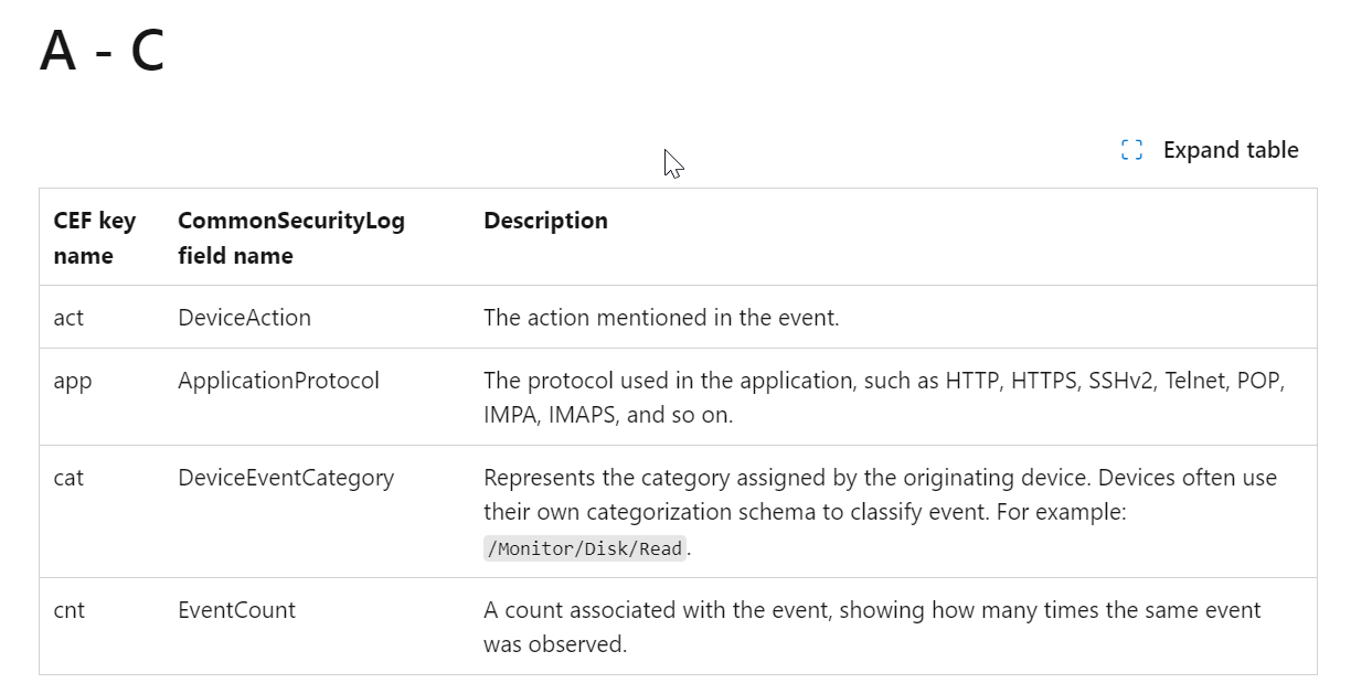 To normalize this data into the CommonSecurityLog table, I used the following CEF and CommonSecurityLog field mapping and CommonSecurityLog table reference guide provided in the Microsoft Learn. These guides exactly describe which CEF fields corresponds with which columns in the CommonSecurityLog table and tells you in which data format they should be.