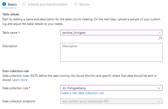 - Define a table name, data collection rule name, and data collection endpoint name