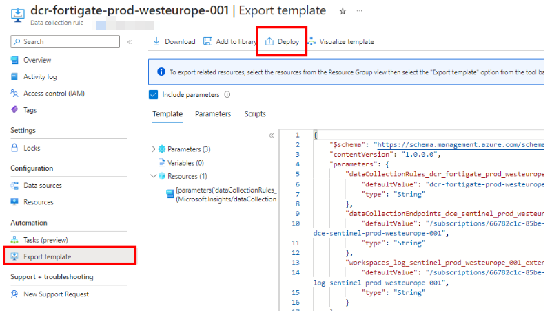 - Go to the DCR you created an navigate to export template > deploy