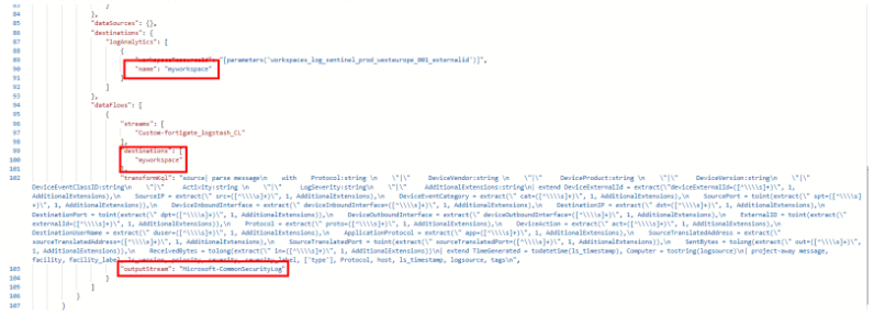 - Now click on ‘Edit template’ and change the outputstream to ‘Microsoft-CommonSecurityLog’. This will change the destination table to the CommonSecurityLog table instead of the custom table we created earlier. Optionally, you can also change the workspace to something like ‘myworkspace’.