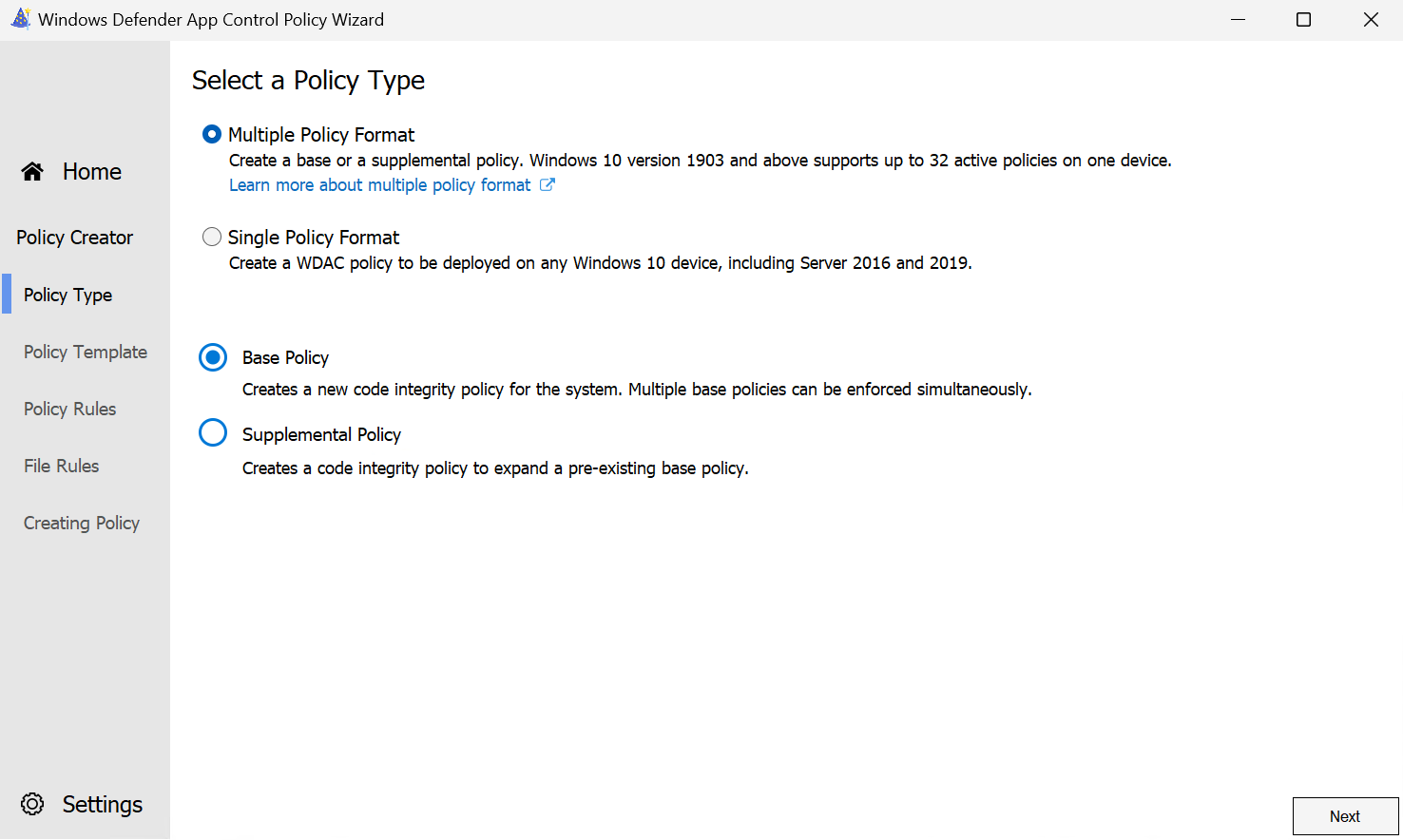 - Whether you want to build upon an existing policy or not, you can choose to create a base policy or a supplemental policy. For this example we will create a base policy.