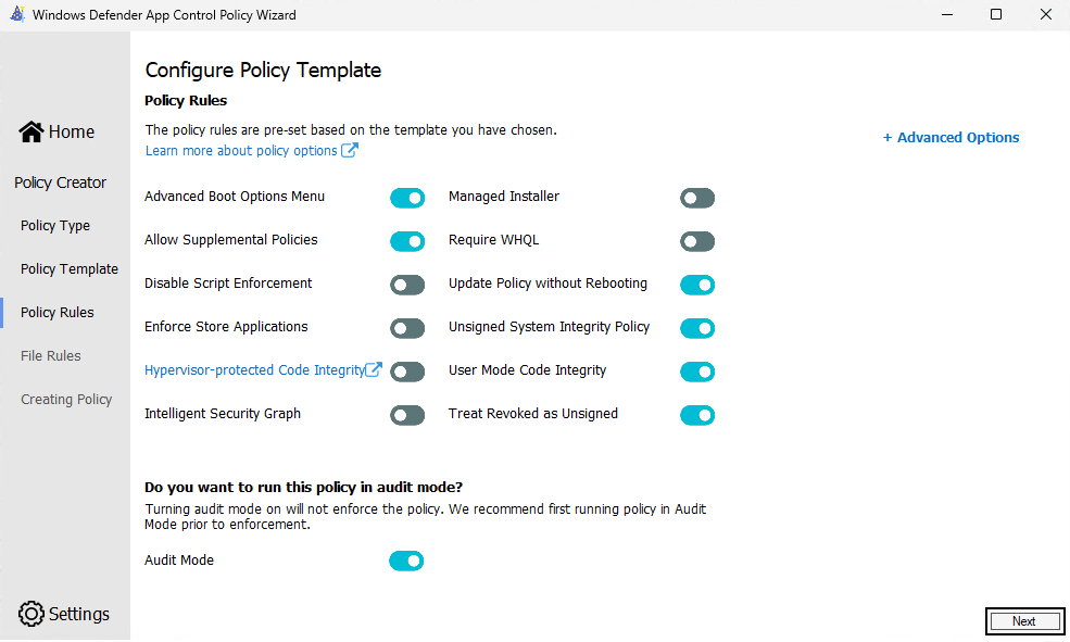 - In the next phase we can set a couple of settings for the policy. I leave in this example everything default, but do make sure that the audit mode is enabled here!
