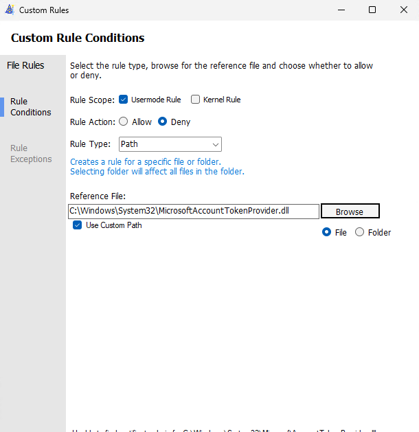 - Create a new deny FilePath rule for MicrosoftAccountTokenProvider.dll in usermode